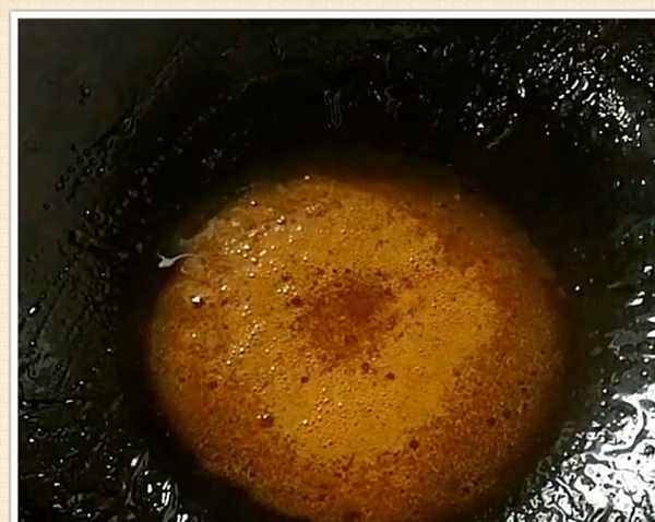 接下來炒鍋洗凈加入少許食用油,起到提亮顏色的作用,然後倒入適量冰糖和清水,然後開小火不停的翻炒,把冰糖炒至融化。