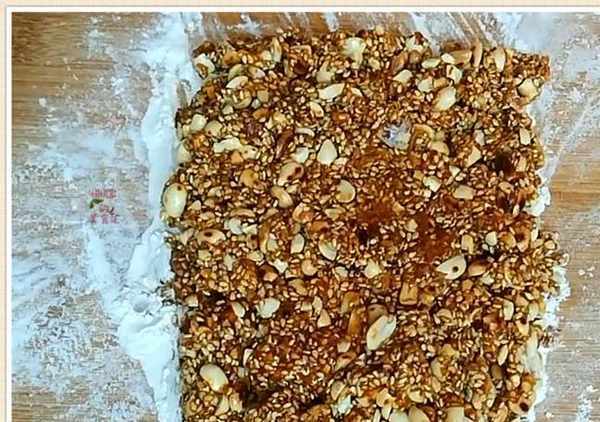 然後再把白芝麻也倒入鍋中快速的翻拌均勻,讓花生芝麻和糖汁完全的融合在一起,接下來我們把熟面粉撒在案板上面,然後再鏟出炒好的芝麻花生碎,這個時候它是不成團的,比較松散,