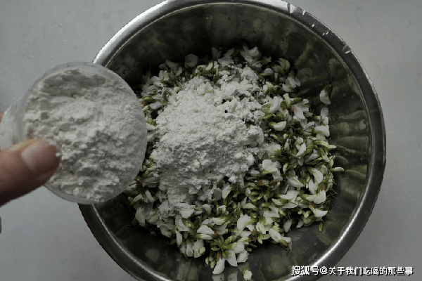 2、把槐花放入大盆中,加入適量食鹽、五香粉、食用油攪拌均勻,讓槐花表面沾上一點油,再倒入一些面粉用手拌勻,裹上一層薄薄的淀粉。
