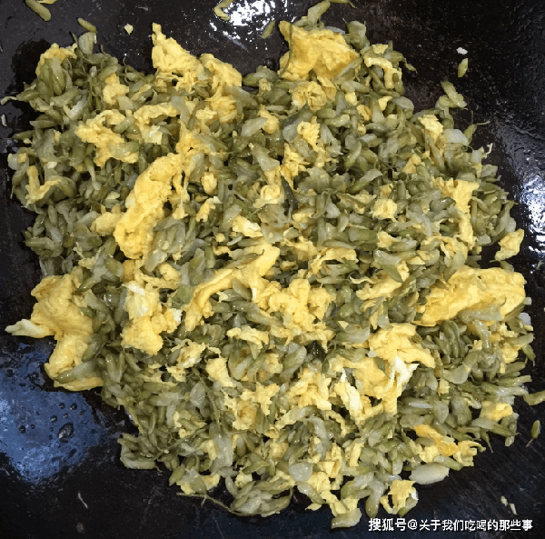 2、起鍋,倒入多一點食用油,燒熱後倒入雞蛋液,大火煎一會兒,熟透後用鏟子炒出大塊,盛出備用,鍋裡留底油,放入蒜末、蔥花爆香,倒入槐花,大火翻炒一會兒,倒入炒好的雞蛋炒勻,即可出鍋。