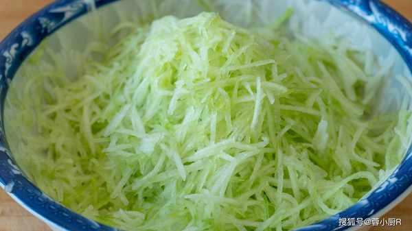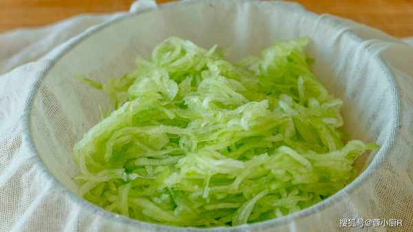 3、10分鐘後冬瓜出瞭很多水,找一塊兒紗佈,把冬瓜絲放進來,包好後用力擠幹裡面的水分。