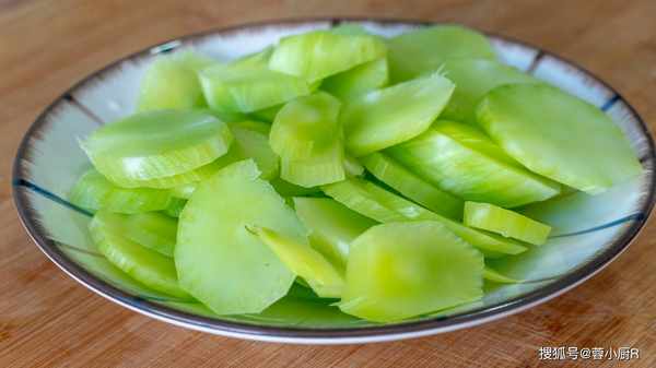 2、萵筍一根,去皮後切片,稍微的厚一點點就可以,吃起來會更脆嫩。再準備一個紅辣椒配色,切片就行。