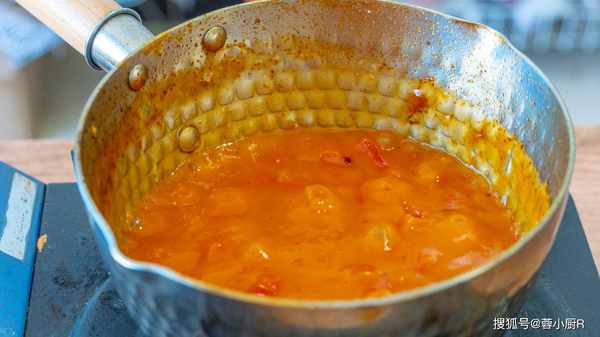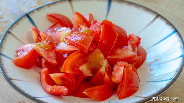 11、起鍋熱油,倒入西紅柿翻炒,加一勺鹽更容易出汁兒,繼續炒,炒到西紅柿出沙後倒入調好的淀粉水,開大火煮,煮到湯汁變濃稠後關火。
