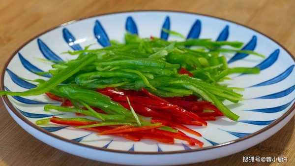4、然後將西葫蘆絲、青紅椒絲擺入盤中;