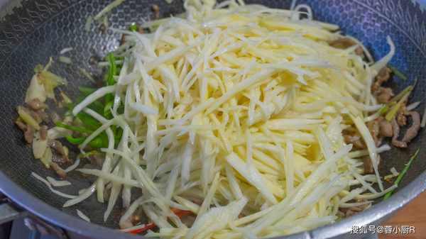 8、接著起鍋熱油,放入醃制好的肉絲,大火翻炒均勻,變色後倒入蔥薑蒜。