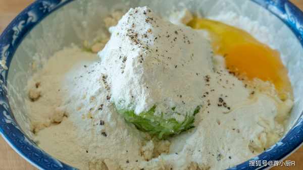 6、然後放入擠幹水分的冬瓜,再加1勺淀粉、1勺面粉、1個雞蛋、1勺鹽、1勺胡椒粉,上手朝著一個方向攪拌均勻。