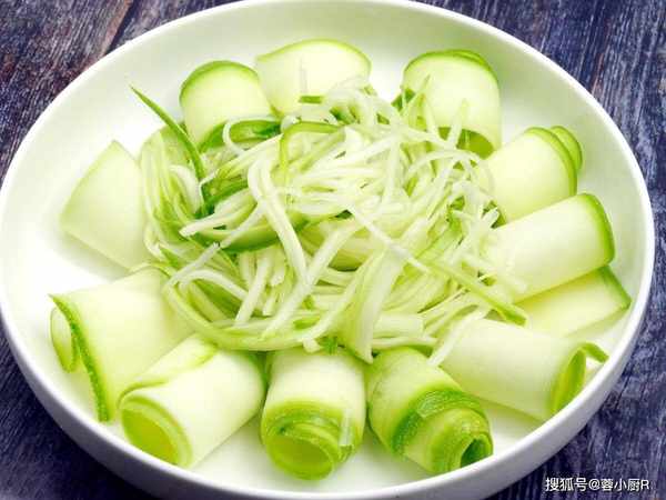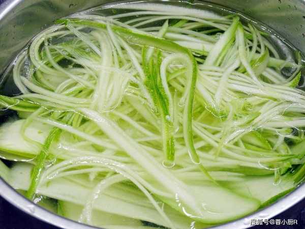 1、西葫蘆一部分刨成片,一部分擦絲,泡在淡鹽水裡1分鐘,擠幹水份備用;