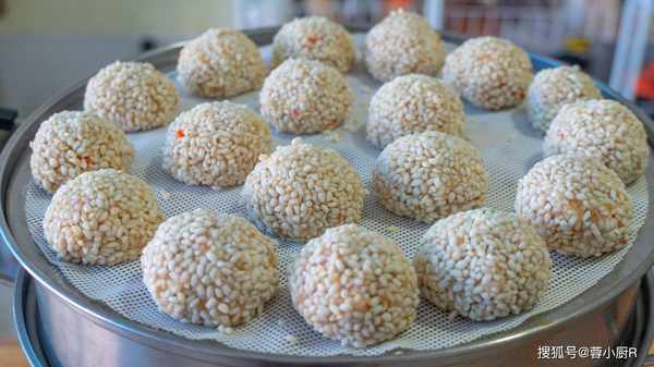 9、然後滾上一圈糯米後稍微的整理一下。接著就可以入蒸鍋瞭,把糯米丸子一個個地擺放進來,接著水開計時,大火蒸40分鐘。