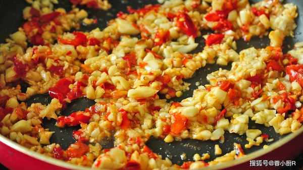 3、鍋燒熱後加少許食用油,油熱後把蒜末加進去,小火炒至蒜末稍微變色,然後加2勺自己做的剁椒醬,翻炒均勻後就可以出鍋裝盤瞭;