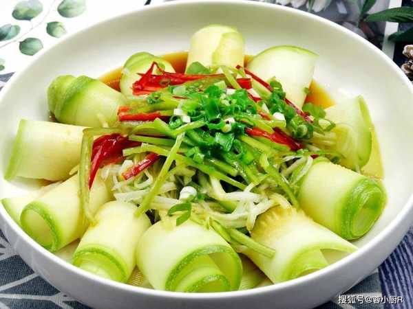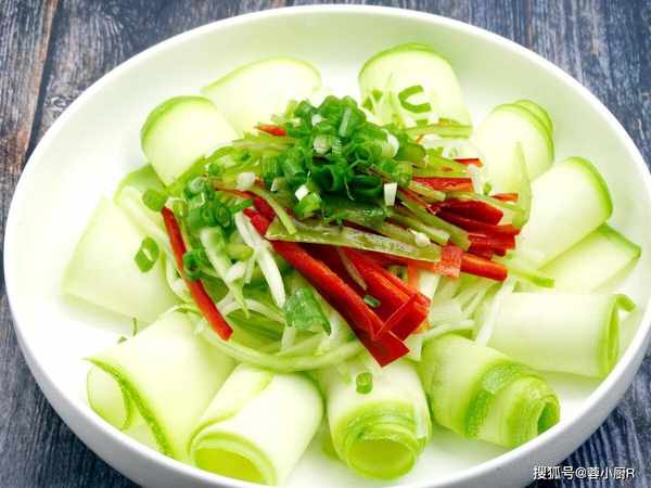 食材:西葫蘆、大蒜、青紅辣椒各一個、生抽、米醋、白糖、香油