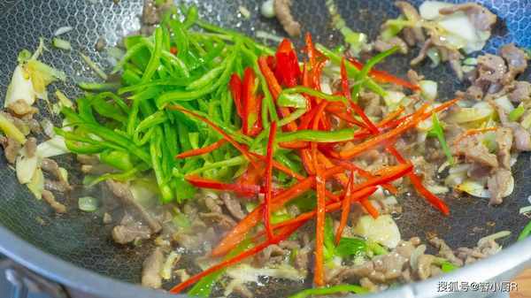 9、炒香後倒入青紅辣椒絲和茭白,繼續大火翻炒2分鐘。