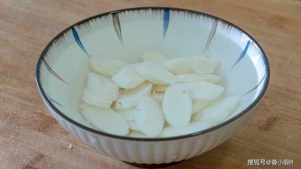 1、山藥一根,去皮後切片,裝到碗裡後加清水泡著,避免氧化變黑,再來一勺白醋,口感會更清脆。對山藥過敏的記得戴上手套操作哦!