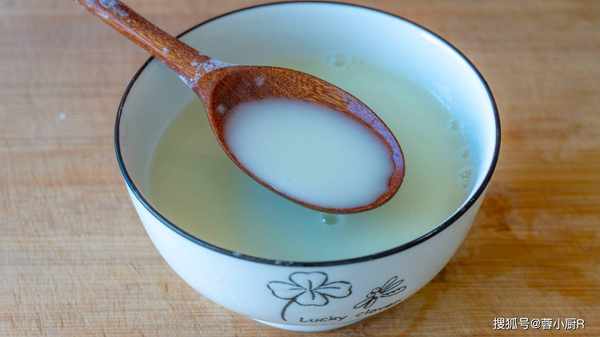 9、趁著蒸丸子的時間來調個醬汁,1勺淀粉,半碗冬瓜水攪拌均勻。
