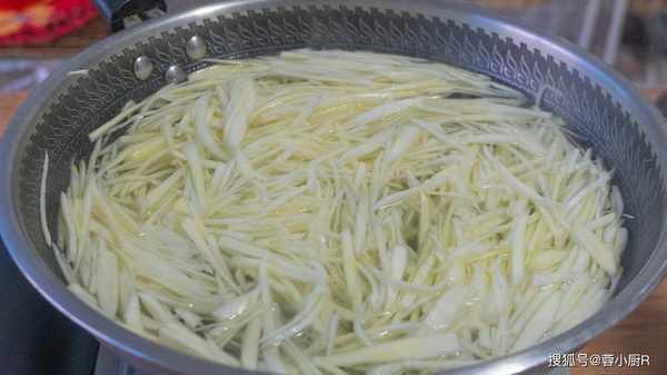 2、刮好後就可以開始切瞭,選斜刀切薄片,然後再切成細絲,切好後先放一旁備用。