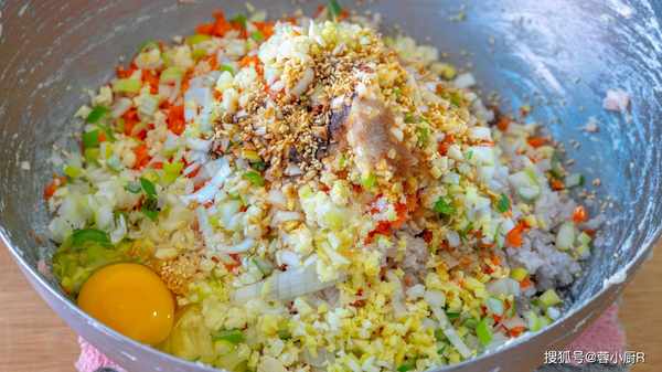 7、我們準備一個大碗,先把肉餡兒倒進來,接著分幾次把泡好的花椒水也倒進來,朝著一個方向攪打上勁兒 ,攪拌到感覺有阻力的時候就可以瞭。再把胡蘿卜、藕、蔥薑蒜都加進來,接著開始調味兒,鹽、糖、生抽、老抽、雞精,最後再打入1個雞蛋,攪拌均勻後餡兒就調好瞭。
