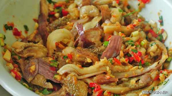 5、現在茄子也蒸好瞭,我們將它取出來,等到不燙手的時候把它撕成小塊,這種茄子的中間是有肉的特別的好吃,全部撕好後把剛剛調的醬也淋上去,然後攪拌均勻後就可以開吃啦;
