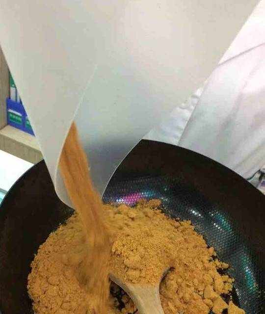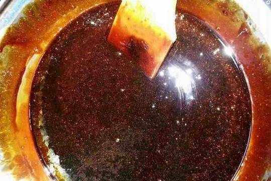5.冰糖融化後,轉微火,然後放阿膠粉。這個時候要不停攪拌,隻要它不粘鍋就可以,大概攪拌半個小時樣子,牽絲就代表可以放輔料瞭。