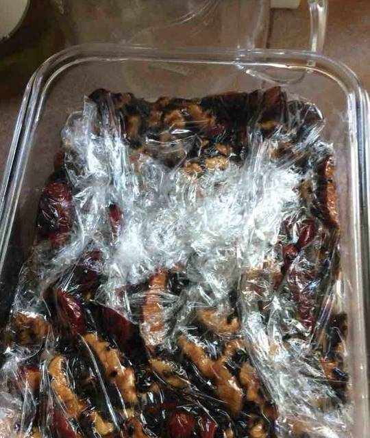 10.保鮮盒準備好,鋪上保鮮膜(保鮮膜拉長一點,等下上面也好鋪上)在保鮮膜上抹上芝麻油,備好以後把熬好的阿膠放保鮮盒裡,然後用保鮮膜把阿膠壓平,壓緊。等降溫瞭就放冰箱急凍。