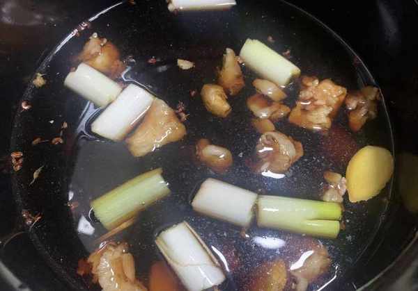 3、放入蔥段、薑片炒香,淋入料酒翻炒去腥,再加入適量生抽、老抽翻炒均勻,倒入適量開水,大火煮開後小火煮20分鐘。