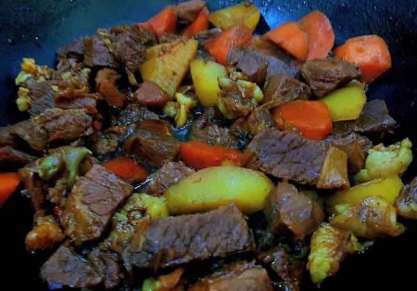 4、放入土豆塊、胡蘿卜塊,翻炒均勻後繼續煮20分鐘。牛肉燉得軟爛後,開大火收汁,加入適量食鹽,不停地翻炒,等到湯汁濃鬱後即可出鍋。