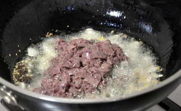 3、起鍋燒油,放入花椒炸香,放入薑蒜末爆香,倒入醃好的腰花大火快速翻炒一會兒,變色後倒入泡椒翻炒一會兒,再倒入韭黃翻炒至斷生。