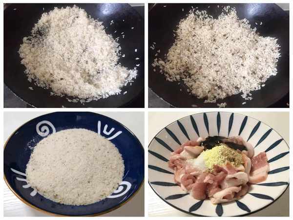 (1)先做米粉,把米淘洗3遍,控幹水分,鍋中不用放油,倒入大米炒幹水分,不要炒得太幹,容易爆成米花