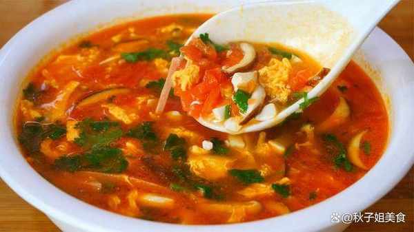 2、鍋中水燒開,放入香菇焯下水,一分鐘撈出,鍋中加點油。下入西紅柿炒出汁,加上點水。下個香菇、火腿絲。再次燒開後,改成小火,淋入雞蛋液,放點香油,撒上香菜,美味的西紅柿三鮮湯做好瞭。