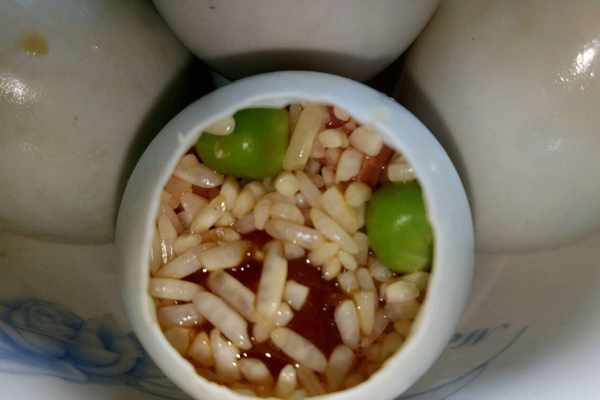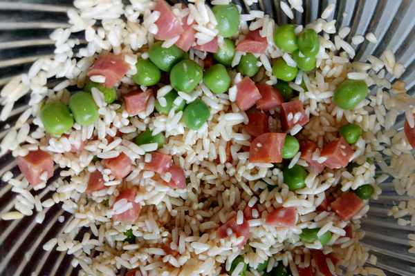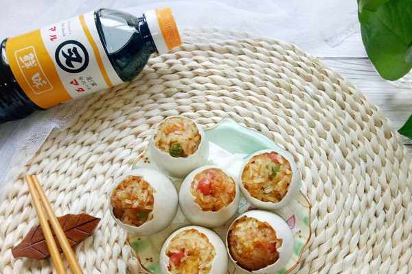 [所需菜品]:咸蛋十個,糯米120克,烤腸兩根,甜豆35克,又伊鮮醬油18克,芝麻油10克。