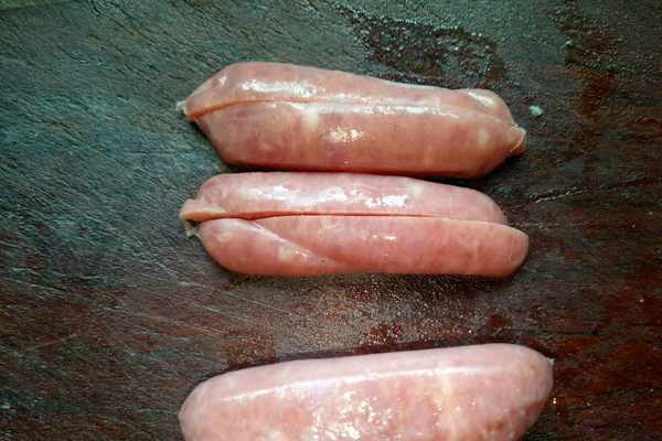 2、把小烤腸切成條,再切成烤腸丁,烤腸丁不要切得太大,因為等一下要裝入鴨蛋裡,切得太大會占用空間,就放不進去別的食材啦。