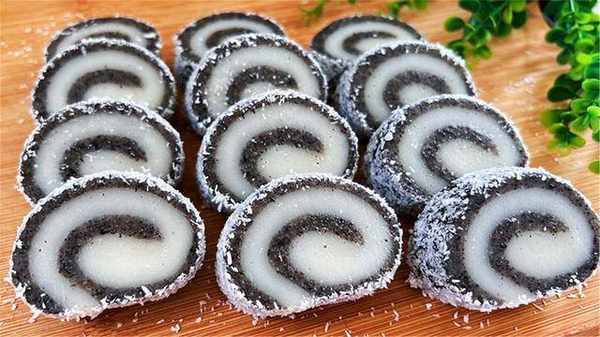 3、起鍋燒水,水開放入面糊大火蒸15分鐘蒸熟。接著倒入白色面糊,再大火繼續蒸15分鐘。蒸熟後取出來,微微放涼後一邊卷起來,稍微地搓一搓,表面再撒上一層椰蓉。切成小塊,黑芝麻糯米糕就做好瞭。