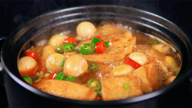 2、五花肉去皮後切成薄片、鍋中放入五花肉,小火煸炒出油脂,炒出香味。然後倒入鵪鶉蛋煎一下,註意要用小火,要不然容易爆。再加蒜片、薑末,一勺黃豆醬,豆瓣醬炒出紅油,倒入適量的清水,然後加一點老抽,適量的鹽和胡椒粉,直接倒入砂鍋中小火煮八到十分鐘,最後來點青紅椒,蔥花,豆腐煲就做好瞭。