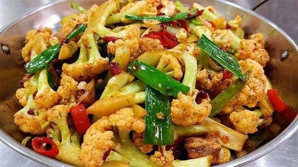 2、鍋中油燒至六成熱後,將花菜下鍋炸個半分鐘左右即可撈去控油,再將五花肉冷油下鍋煸炒出油脂,炒出香味,炒至微微發黃,再下入大蒜子、青紅椒爆香,然後倒入幹鍋醬炒出紅油,倒入花菜繼續翻炒炒入味。再下入青炒苗,點蒸魚豉油,翻炒均勻後即可出鍋。