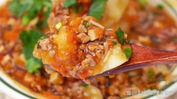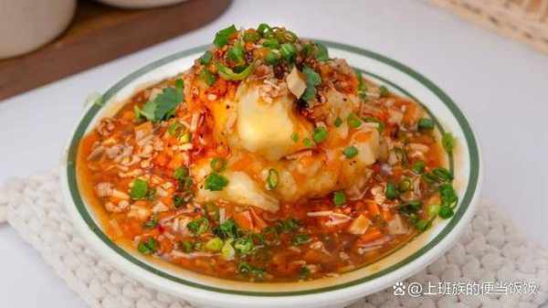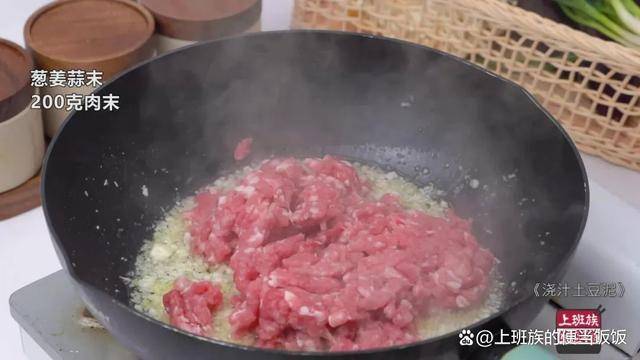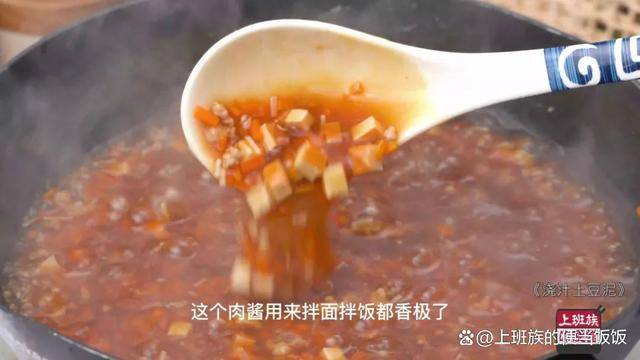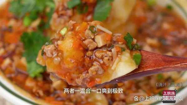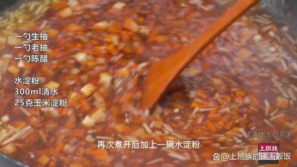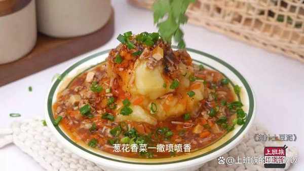 土豆蒸熟後簡單調味壓成泥,然後淋上這個肉醬汁,香菜蔥花稍加點綴就完成瞭。