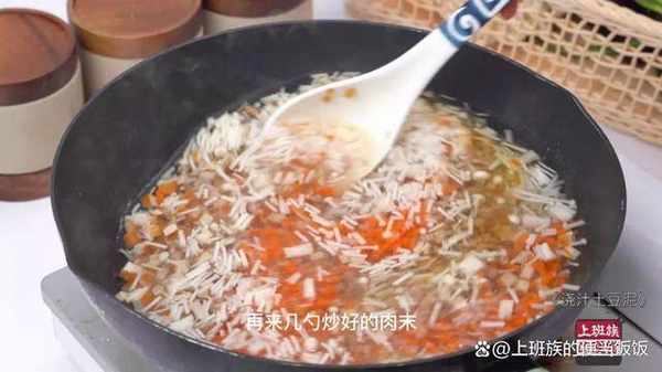 水開,把切好的蔬菜丁倒下去,再來幾勺炒好的肉末。