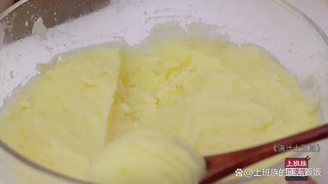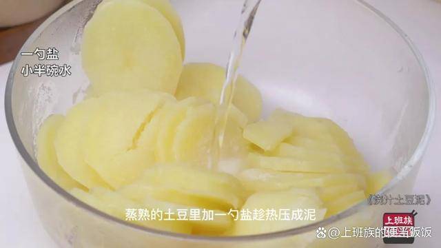 蒸熟的土豆裡,加一勺鹽,趁熱給壓成泥,盡量壓細膩一點。