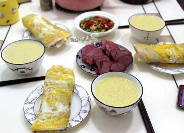 六:雞蛋卷餅+五香牛肉+小米粥