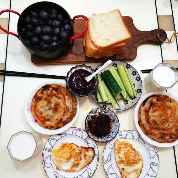 這樣的搭配全家各取所需,營養和口味都有了。做法其實不難,吐司和千層餅都是提前做好的,早上把千層餅煎熟,牛奶加熱,全部擺上桌就可以,都用不了10分鐘。下麵就關鍵說一下千層餅的做法。