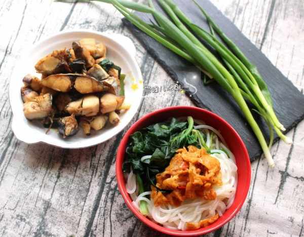 這一餐是最簡單的一餐,米粉煮熟調味,五香鮁魚提前做好,早上加熱即成,也可以凉吃,再配上小葱,味道十足。五香鮁魚做法其實不複雜,一起看看。