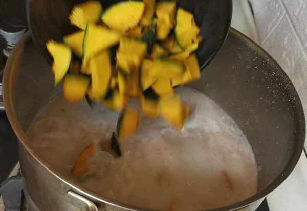 第五步:倒入南瓜塊,大火燒開,改成小火慢慢的燉大約10分鐘,南瓜熟透。