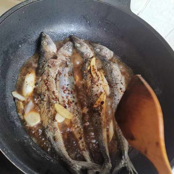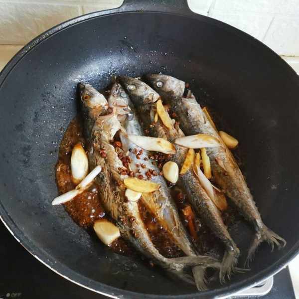 所用資料:小鮁魚4條,葱段,薑片,醬油半勺,醋1勺,紅糖1勺,鹽少許,花椒,大料,大蒜2瓣,料酒1勺,花生油1大勺。