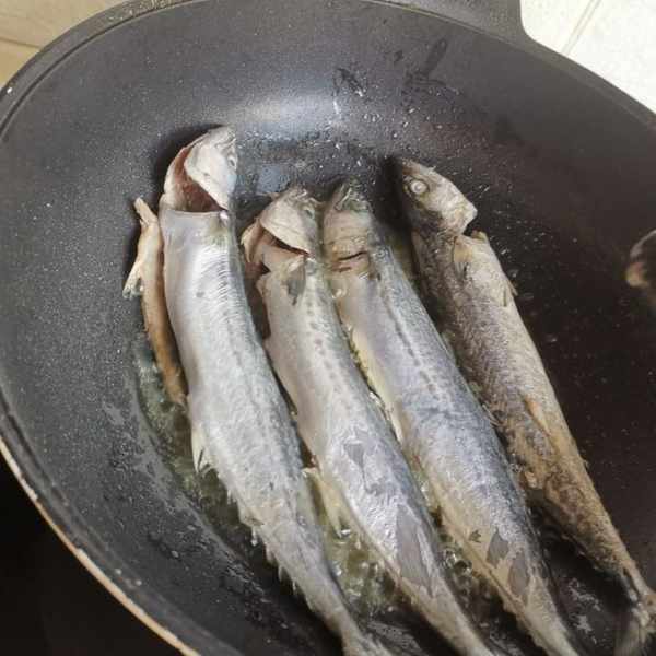 第三步:鍋裏放入花生油,燒熱,放入小鮁魚煎至稍微發黃,烹上一勺料酒去腥,沒有料酒白酒或者啤酒都可以。鮁魚腥味稍大,一定要烹點酒去除腥味才更好吃。
