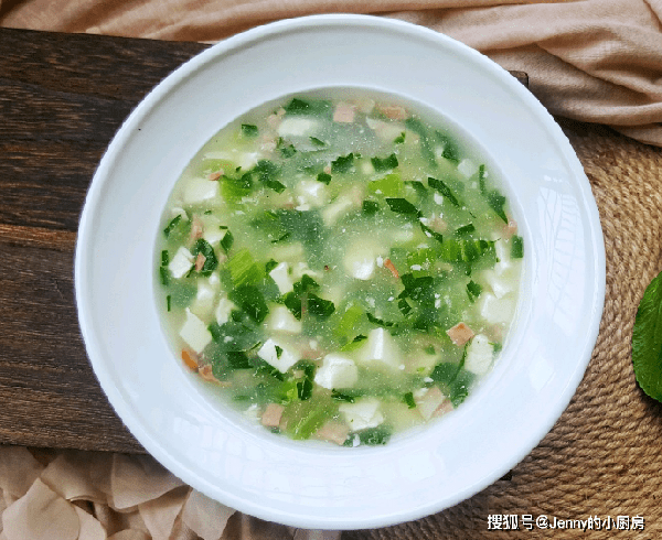 接著將豆腐丁倒進去攪拌均勻,再次煮沸騰,將青菜碎倒進去攪拌均勻。