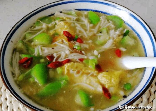 然後倒入薑絲爆香,再倒入絲瓜翻炒,炒一分鐘。接著倒入適量清水,大火煮開,再放入金針菇、雞蛋,煮三分鐘。