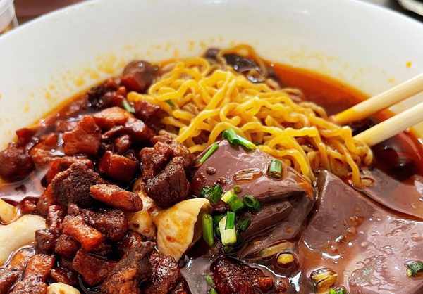 據說這傢店的師傅原來是在大南門,為此還特地去學過手藝,從面條制作再到豬肉、脆哨、澆頭的選料都有講究,他傢面是選用純手工制作的雞蛋面,面條新鮮,很有特色,有點硬和嚼勁,看起來和方便面一樣是卷的,面還不怎麼吸湯。豆芽打底,放上面加入湯和澆頭,最上面漂著一層紅油,看起來十分厚重,但燙頭喝起來一點不油膩,香辣且略帶清爽感,據老板介紹他傢腸旺面的特點是,不加任何添加劑和香料,隻有筒子骨熬制的骨湯,喝起來醇香不膩。