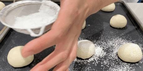 ?step04:面團醒發15分鐘後,將面團揉圓排氣再撒上淀粉(防止烘烤時顏色過深)。