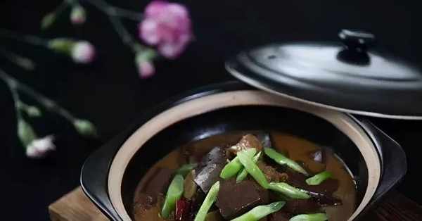 2、老蔥切段,用豆油煸炒,放入油渣、高湯、豬血同煮,加鹽、雞精、老抽、幹辣椒調味,小火煮2分鐘,出鍋前放白糖,裝入燒熱的砂鍋即可。
