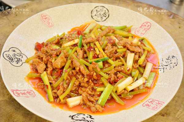 6.保持最大火將鍋中的油加熱到60%的油溫,將泡椒和郫縣豆瓣迅速炒出香味和湯色。炒好後,倒入薑蒜米繼續炒。聞到薑蒜的味道後,倒入真菌和竹筍,快速炒勻。然後倒入肉絲,倒入汁中,快速炒12秒,撒上蔥花,關火炒勻。