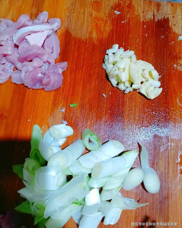 茭白清洗幹凈後切絲放入盤中備用,豬肉清洗幹凈切絲,大蒜和大蔥清洗幹凈切蒜末和和斜刀切蔥段,食材準備好瞭之後,放入盤中備用。