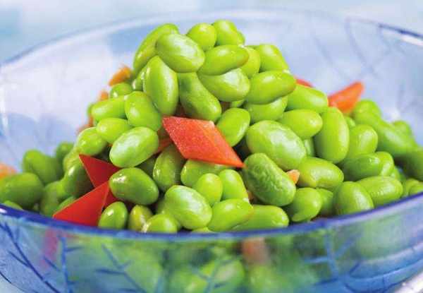 材料:嫩蠶豆350克,紅椒50克,精鹽1/2小匙,味精少許,香油2小匙。