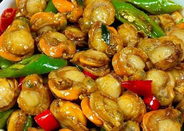 3.然後再倒入扇貝肉一起翻炒均勻,淋入調好的醬汁,繼續翻炒收汁,接著倒入青椒一起翻炒。